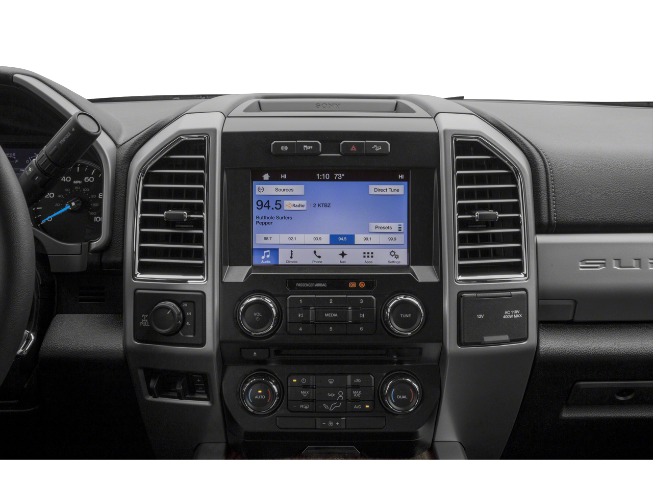 5th Wheel/Gooseneck Hitch Prep Package, Chrome Package, FX4 Off-Road Package, GVWR: 10,000 lb Payload Package, Order Code 608A, 4WD, 10 Speakers, 110V/400W Outlet, 3.73 Axle Ratio, 4-Wheel Disc Brakes, 6 Angular Chrome Step Bar, ABS brakes, Adjustable pedals, Air Conditioning, Alloy wheels, AM/FM radio: SiriusXM, AppLink/Apple CarPlay and Android Auto, Auto-dimming Rear-View mirror, Automatic temperature control, BLIS Blind Spot Information System, Brake assist, Bumpers: chrome, Compass, Delay-off headlights, Driver door bin, Driver vanity mirror, Dual Extra Heavy-Duty Alternators (Total 377-Amps), Dual front impact airbags, Dual front side impact airbags, Electronic Stability Control, Emergency communication system: SYNC 3 911 Assist, Engine Block Heater, Exterior Parking Camera Rear, Flow-Through Console, Front anti-roll bar, Front Bucket Seats, Front Center Armrest, Front dual zone A/C, Front fog lights, Front Leather Seating Surfaces 40/Console/40, Front reading lights, Fully automatic headlights, Heated door mirrors, Illuminated entry, Leather steering wheel, LED Box Lighting, Low tire pressure warning, Outside temperature display, Overhead airbag, Overhead console, Panic alarm, Passenger door bin, Passenger vanity mirror, Power door mirrors, Power driver seat, Power passenger seat, Power steering, Power windows, Quad Beam LED Headlamps & LED Taillamps, Radio data system, Radio: B&O Sound System by Bang & Olufsen, Rear Parking Sensors, Rear reading lights, Rear seat center armrest, Rear step bumper, Rear window defroster, Remote keyless entry, Remote Start System, Security system, SiriusXM Radio, Speed control, Split folding rear seat, Steering wheel mounted audio controls, SYNC 3 Communications & Entertainment System, Tachometer, Tailgate Step & Handle, Telescoping steering wheel, Tilt steering wheel, Traction control, Trip computer, Turn signal indicator mirrors, Twin Panel Power Moonroof, Upfitter Switches (6), Variably intermittent wipers, Voice-Activated Navigation, Wheels: 18 Bright Machined Cast Aluminum, and Wheels: 20 Chrome PVD Aluminum.
